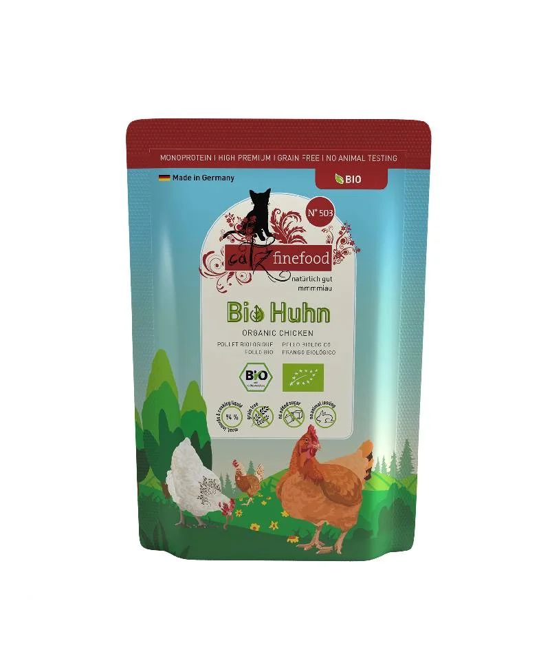 Η βιολογική σειρά Catz Finefood αντιπροσωπεύει τη φυσική σίτιση για τις γάτες. Τουλάχιστον 94% φρέσκο κρέας ή ψάρι καθώς και ζωμό μαγειρικής, συμπληρωμένο με άλλα φυσικά υλικά, φιλικά προς τις γάτες. Η μικρή λίστα των συστατικών μας είναι μέρος της φιλοσοφίας της Catz Finefood – όσο και αυτονόητο – και για αυτό κάθε ποικιλία βασίζεται σε ένα μόνο ένα είδος ζώου. Ως εκ τούτου είναι ιδανική τροφή για γάτες με τροφικές αλλεργίες. Χωρίς γλουτένη και δημητριακά, χωρίς χρωστικές, αρωματικές ουσίες ή συντηρητικά, χωρίς ζάχαρη, χωρίς γενετική μηχανική και χωρίς δοκιμές σε ζώα! Τα Catz Finefood Bio κατασκευάζονται στη Βαυαρία – Γερμανία και προσφέρονται σε έξι νόστιμες ποικιλίες.