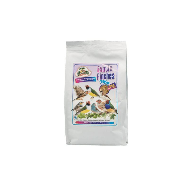 Evia Parrots Ιδανικό μείγμα τροφής για finches. Περιέχει μεγάλη ποικιλία σπόρων (Ασπουρι, Βρωμη, Κεχρι κιτρινο, Κεχρι κοκκινο, Λυναρι, Νιζερ, Πανικουμ κιτρινο, Σουσαμι, Γρασιδι, και βοτάνων ( Ρίγανη, Θυμάρι, Βασιλικό, Μάραθο, Δυόσμο ) ενδείκνυται για τη σωστή και ισσοροπημένη διατροφή των finches.