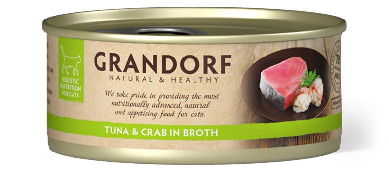 Grandorf κονσερβα γάτας με Φιλέτο τόνου καβούρι σε ζωμό. Για γάτες όλων των ηλικιών με κανονική δραστηριότητα, ευαίσθητη πέψη ή επιρρεπείς σε αλλεργίες.
