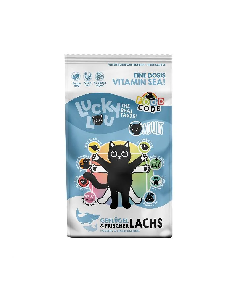 Πλήρης ξηρά τροφή εξαιρετικής ποιότητας για ενήλικες γάτες, χωρίς δημητριακά, γλουτένη, ζάχαρη και πατάτα, με αποξηραμένο κρέας πουλερικών & φρέσκο σολομό.