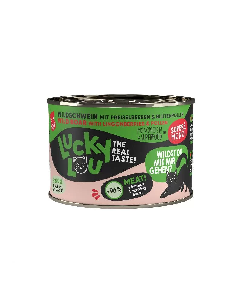 Σύνθεση: Αγριογούρουνο 96,4% (Καρδιά, Μύες, Συκώτι, Πνεύμονες, Ζωμός 31,4%), Αγκινάρα Ιερουσαλήμ 1,5%, Cranberries 1%, Μέταλλα 1%, Γύρη 0,1%. Αναλυτική Σύσταση: Ακατέργαστη πρωτεΐνη 10%, ακατέργαστα λίπη & έλαια 6,5%, ακατέργαστη τέφρα 2%, ακατέργαστες ίνες 0,2%, υγρασία 77,5%. Ενέργεια: 109,47 kcal/100g. Διατροφικά πρόσθετα ανά kg: Βιταμίνη D3 200 I.E./IU/UI, Ψευδάργυρος 25mg, Μαγγάνιο 1,4mg, Χαλκός 1mg, Ιώδιο 0,75mg, Ταυρίνη 1500mg.