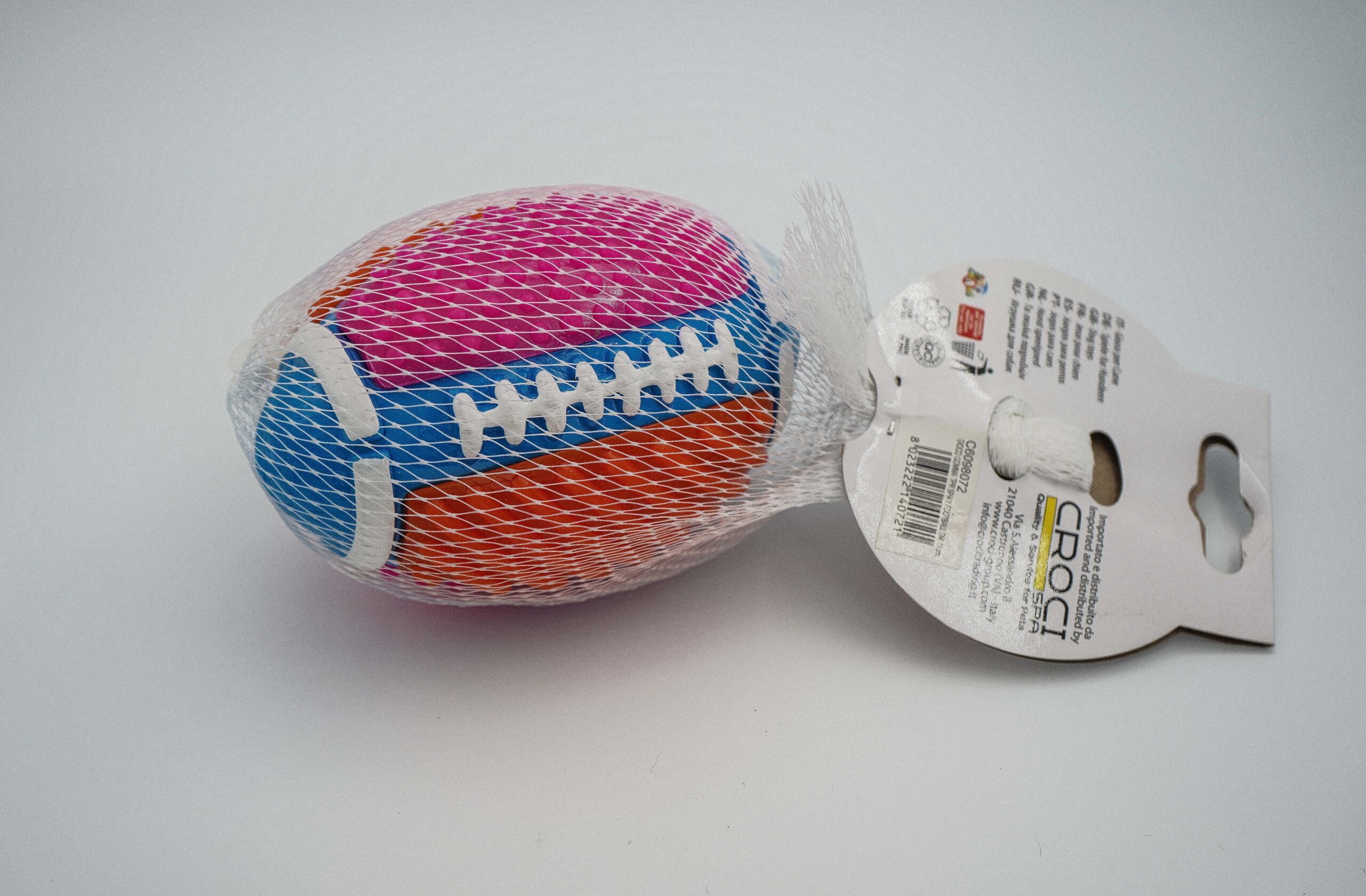 Παιχνίδι σκύλου σε σχήμα μικρής μπάλας rugby, τριών αισθήσεων Crocci, για τον σκύλο σας, πολύχρωμο για να το βλέπει, με πολλά μικρά εξογκώματα για να το αισθάνεται και με ενσωματωμένο κουδουνάκι για να το ακούει καθώς κυλάει, Ιδανικό για ηλικιωμένα σκυλιά, για σκυλιά που βρίσκονται σε αποκατάσταση και για σκυλιά που έχουν περιορισμένη όραση. Αλλά φυσικά και για όλα τα σκυλιά που απολαμβάνουν το παιχνίδι, 11 εκ.