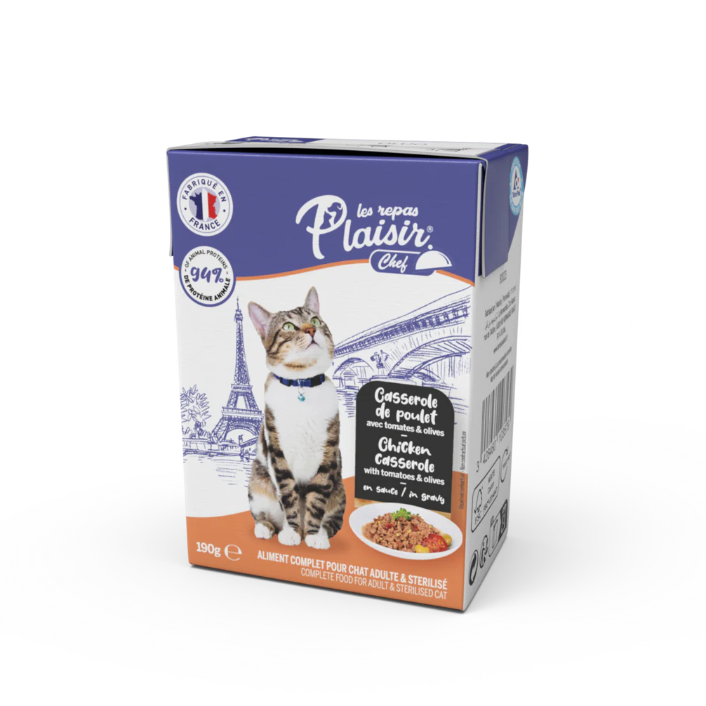 Ραγου κατσαρολας κοτόπουλο σε σάλτσα με ντομάτα και ελιές. Ας κατευθυνθούμε προς τη Μεσόγειο, τη γεύση της ντομάτας, της ελιάς… η γάτα σας δεν θα μπορέσει να αντισταθεί στο Ραγου κατσαρολας μας σε σάλτσα, φτιαγμένες με περισσότερο από 30% κοτόπουλο.