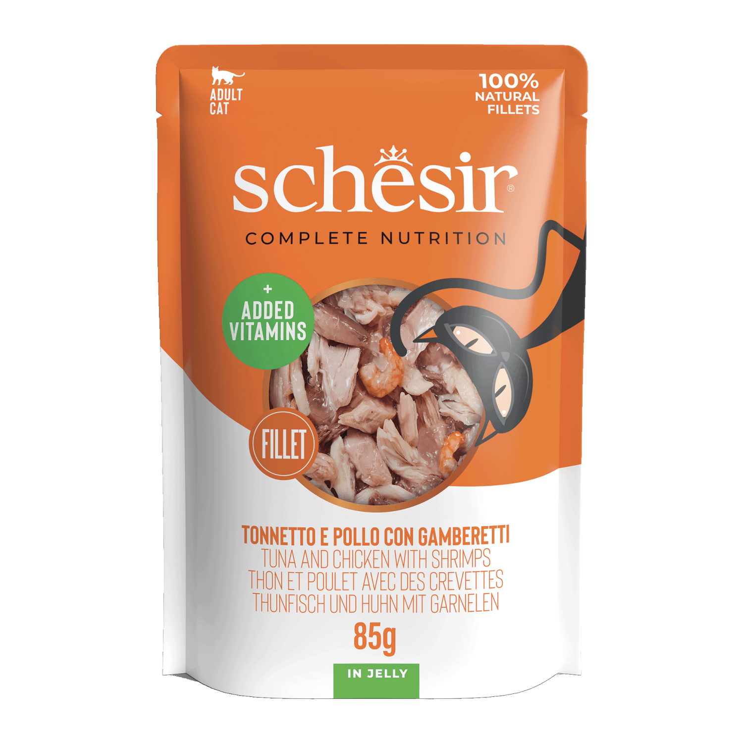 Συστατικά: Τόνος 34%, φιλετάκια κοτόπουλου 23%, γαρίδες 6%, ρύζι 1,5%, Πρωτεΐνη 13,00%, ολικές λιπαρές ουσίες 1,50%, oλικές ινώδεις ουσίες, 0,10%, oλική τέφρα 1,00%, υγρασία 84%, Βιτ. A 1325 UI, βιτ. E 15 mg, ταυρίνη 160 mg