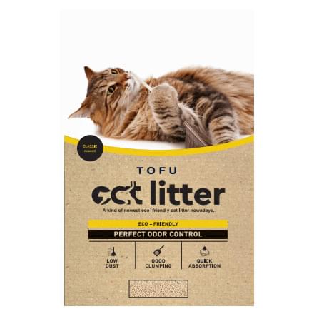 Άμμος γάτας από τόφου, με άμυλο αραβοσίτου και φυτικά συγκολλητικά πρόσθετα.